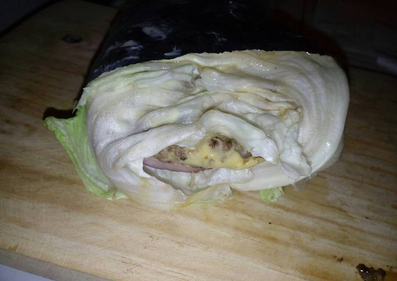 - Ponemos la carne con el queso sobre la hoja con aderezos
