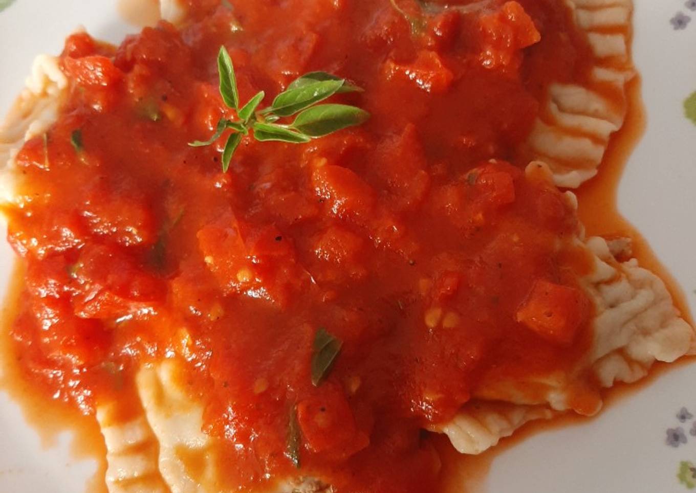- Con otra tira cubre bien, corta y con ayuda de un tenedor, sella la orilla. Deja reposar unos minutos. Vamos hacer la salsa para bañar los ravioles, corta 3 tomates saltea en aceite de oliva, agrega sal pimienta un poco de azúcar, albahaca picada y 1 lata de salsa Hunts deja 2 minutos y listo