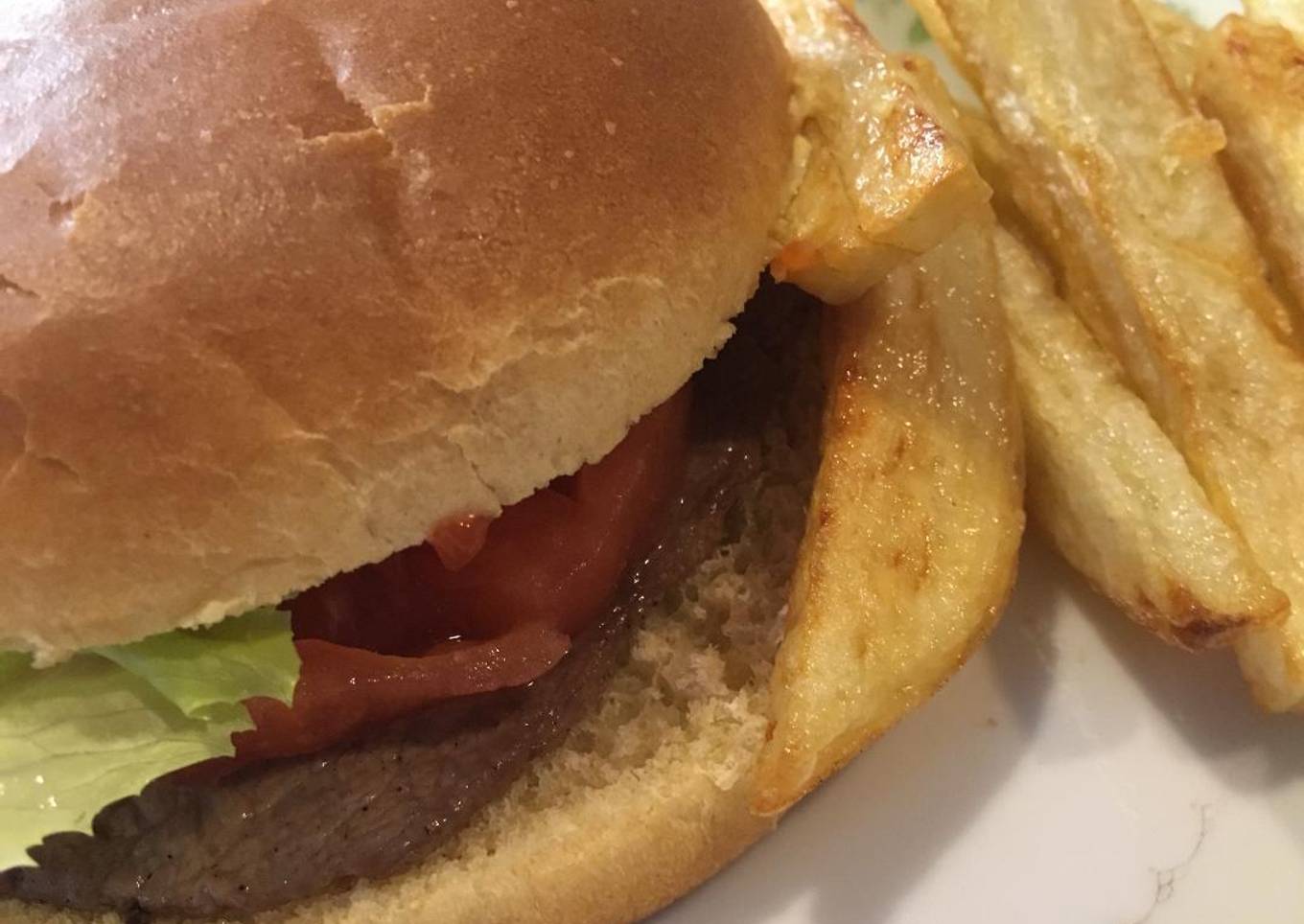 - Utilicé pan de brioche, un jitomate pelado y rebanado, hojas de lechuga, todo acompañado con mostaza amarilla o de Dijon y Ketchup e hice unas papas fritas a la francesa. A la hora de comer calenté muy bien el sartén, le puse un poco de aceite de oliva y coloqué dos medallones aplanados con sal y no los moví durante tres minutos, les di la vuelta y los coloqué sobre el pan abierto y los metí al horno a que se calentaran.
