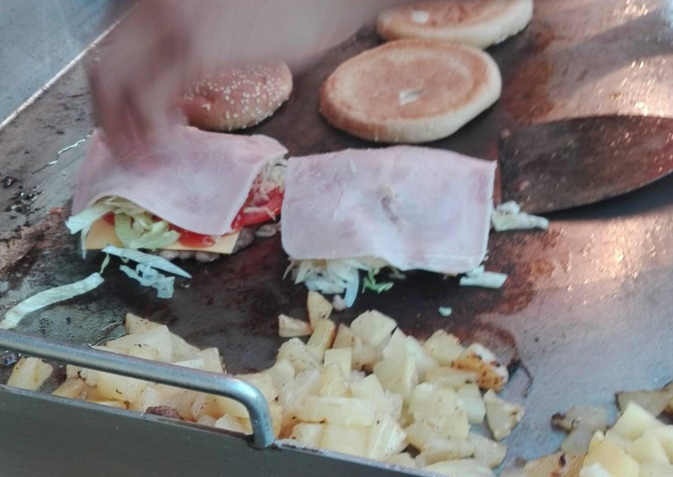- Drena y coloca de lado la piña picada, debe quedar en donde esté menos caliente la plancha. Aplana las pelotas de carne haciendo forma de discos y coloca en la plancha bien caliente, da vuelta al estar bien cocinada de un lado, del otro lado sólo un par de minutos.