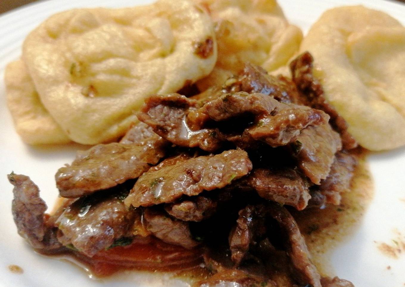 - Continuamos en el sartén con la manteca caliente vamos a saltear la carnes sin sazonar, haciendo que se fría por calor dos minutos, agregamos la salsa de soja salteamos con mucho fuego 30 segundos más. Ahora bajamos a la mitad el fuego, agregamos los ajos, sal, pimienta y los tomates picados, tapamos y dejamos sudar por 3 minutos. Listo a comer.