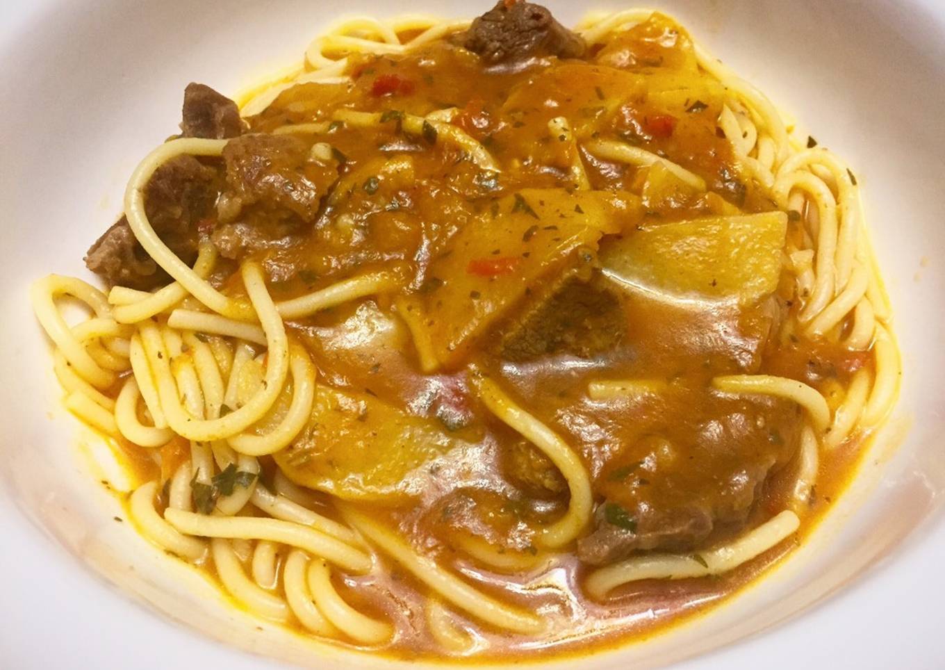 Adaptación del clásico jarrete guisado de PANAMÁ, a una versión caldosa para macarrones, con variantes en la cocción de los ingredientes. Los tomates van al último directo a la pasta, las papas se fríen, y el guiso se licúa para hacer la salsa tersa y limpia, con todo el sabor del plato original...!!! #carne