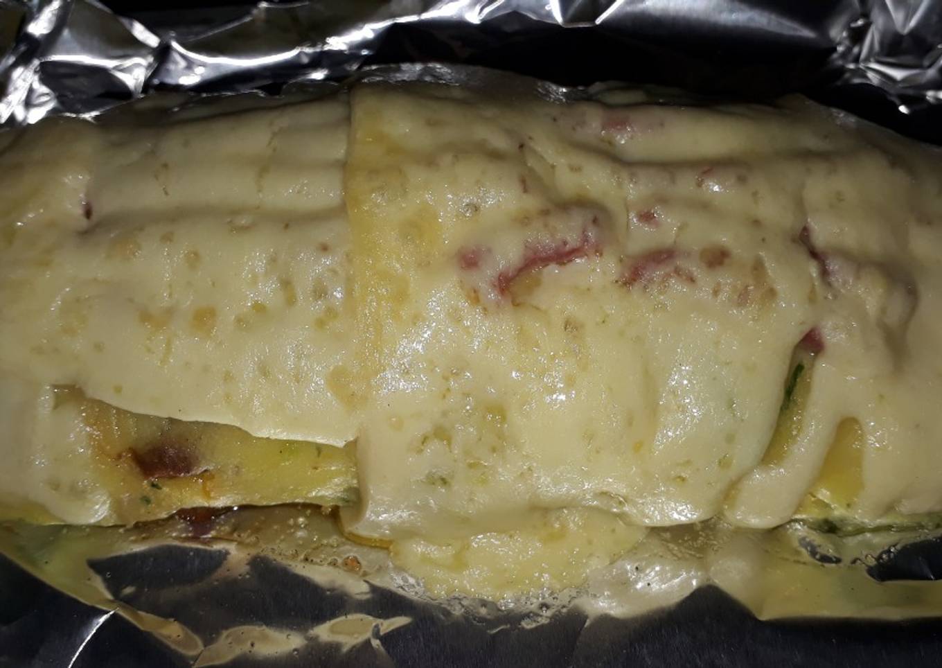 - Enrolar y poner sobre papel aluminio. Colocar jam贸n.