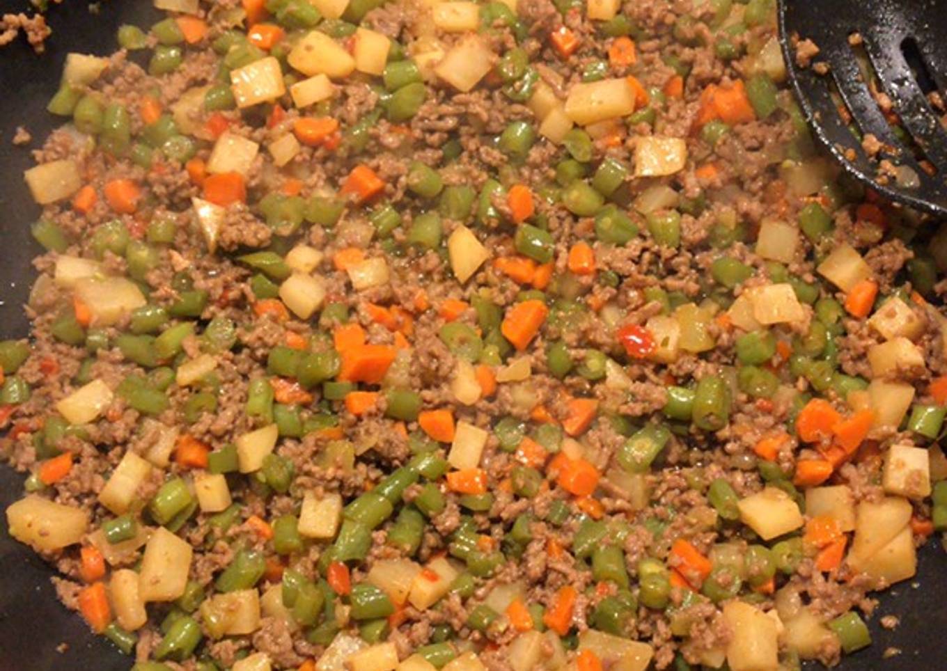 - Cuando ya esté cocida agregar la carne molida y sazonar a su gusto dejarla hasta que esté sellada.