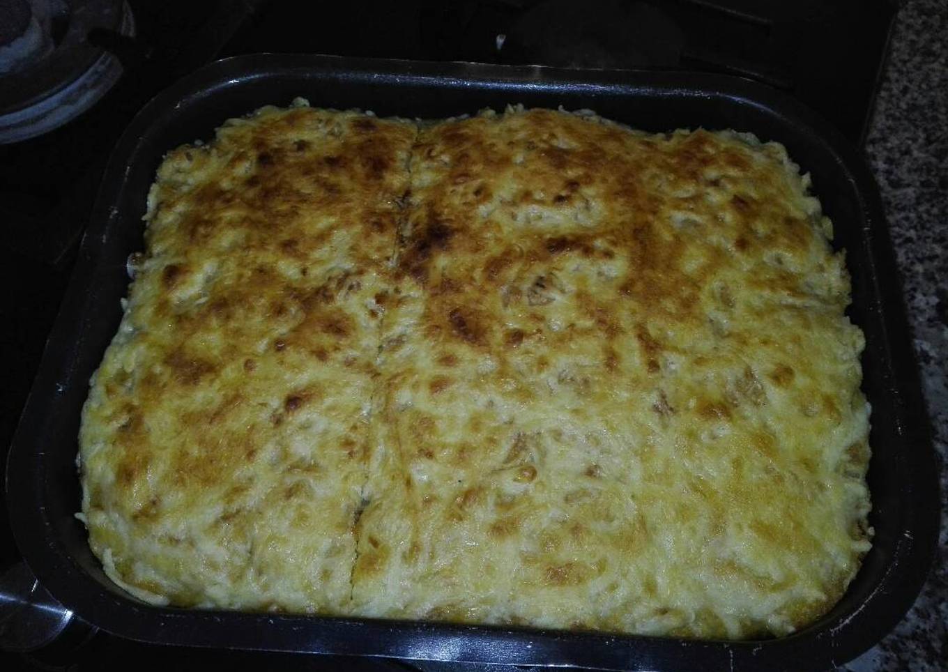 - Ponemos otra capa de puré de patatas y lo cubrimos de queso para gratinar