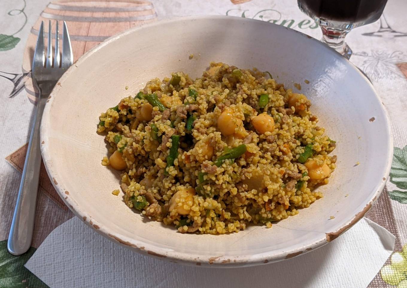 Cous-cous con carne picada, garbanzos y trigueros al Ras-el-Hanout