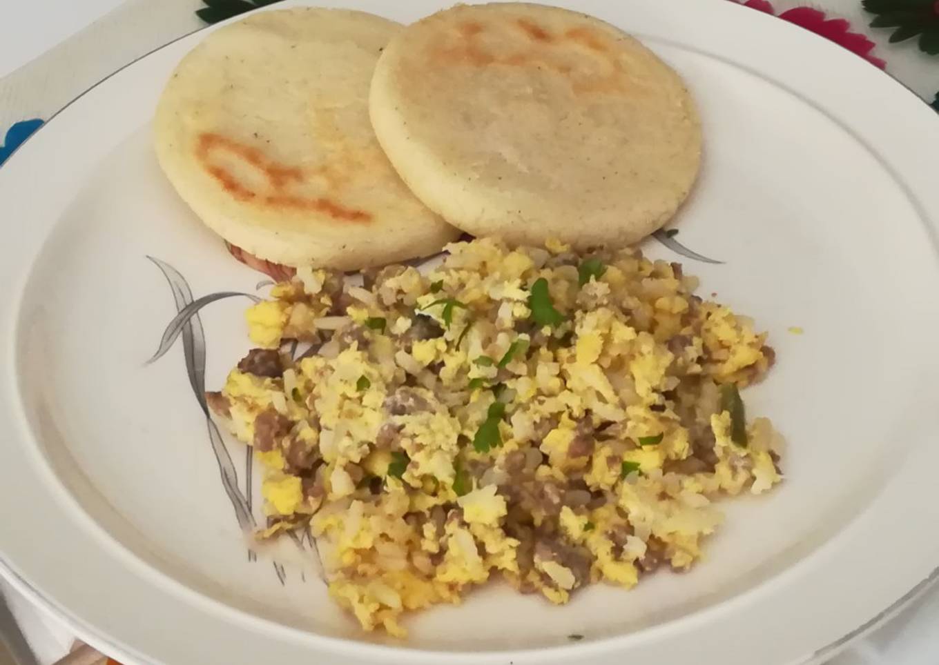 - Baja el fuego y revuelve con frecuencia hasta que los huevos estén húmedos y cocidos. Retira del fuego. Las arepas son la mejor opción para acompañar, también el pan tostado. Adorna con cilantro picado. Qué tengas buen provecho!